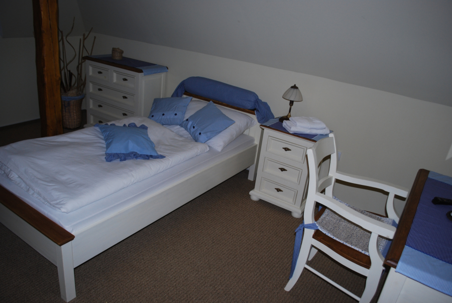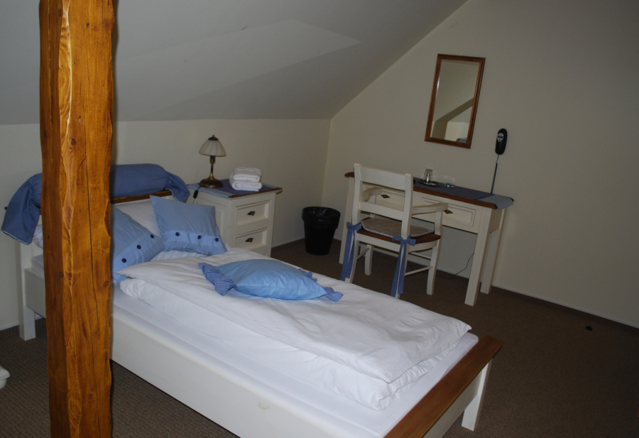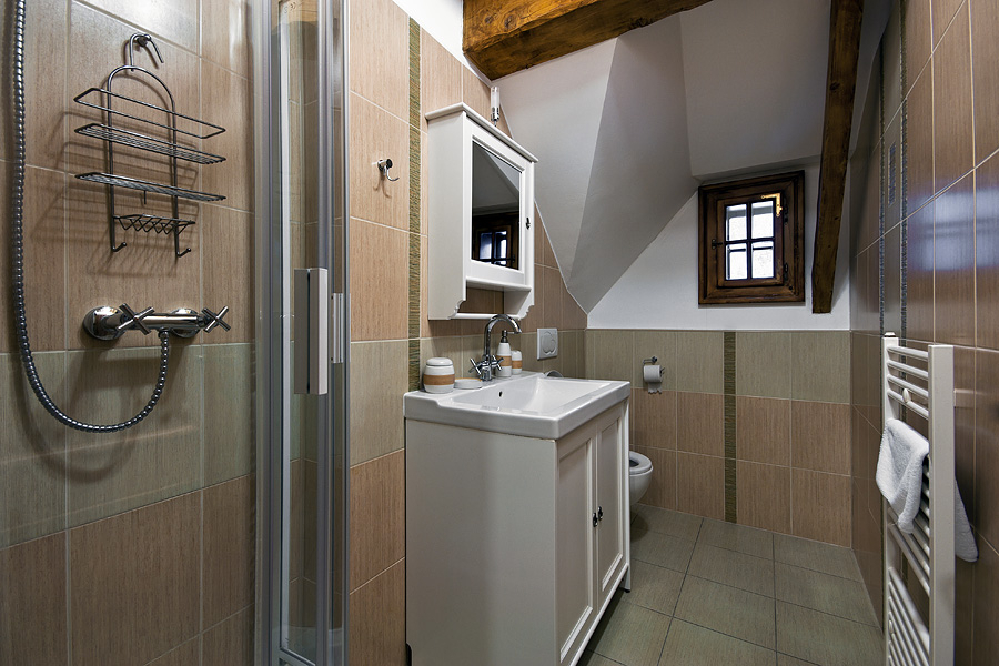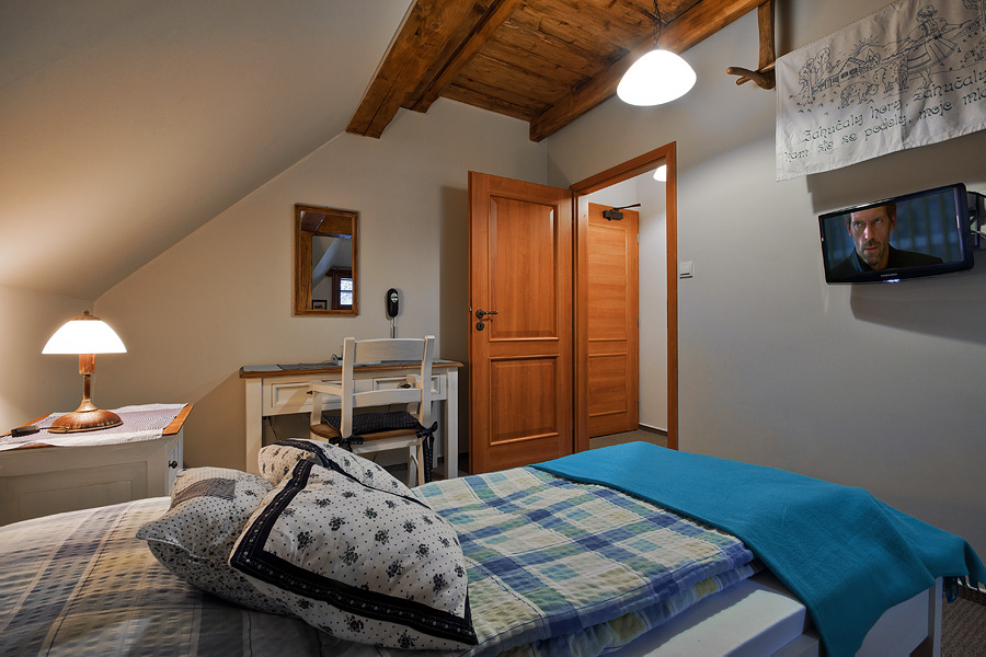 Podkrovná jednolôžková izba s pracovným stolom, TV, samostatnou kúpeľňou so sprchovacím kútom, WC.
