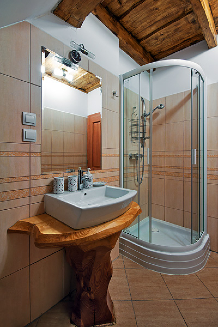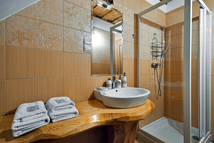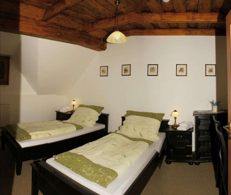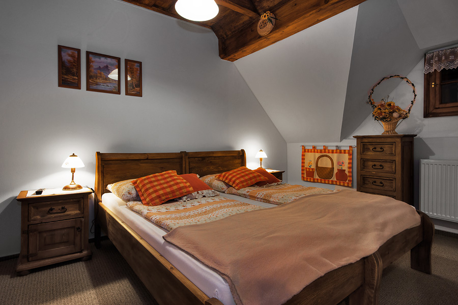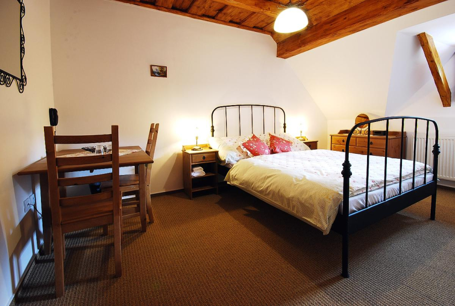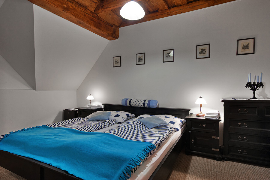 Podkrovná dvojlôžková izba s manželskou posteľou alebo oddelenými posteľami, TV, samostatná kúpeľňa so sprchovacím kútom, WC.